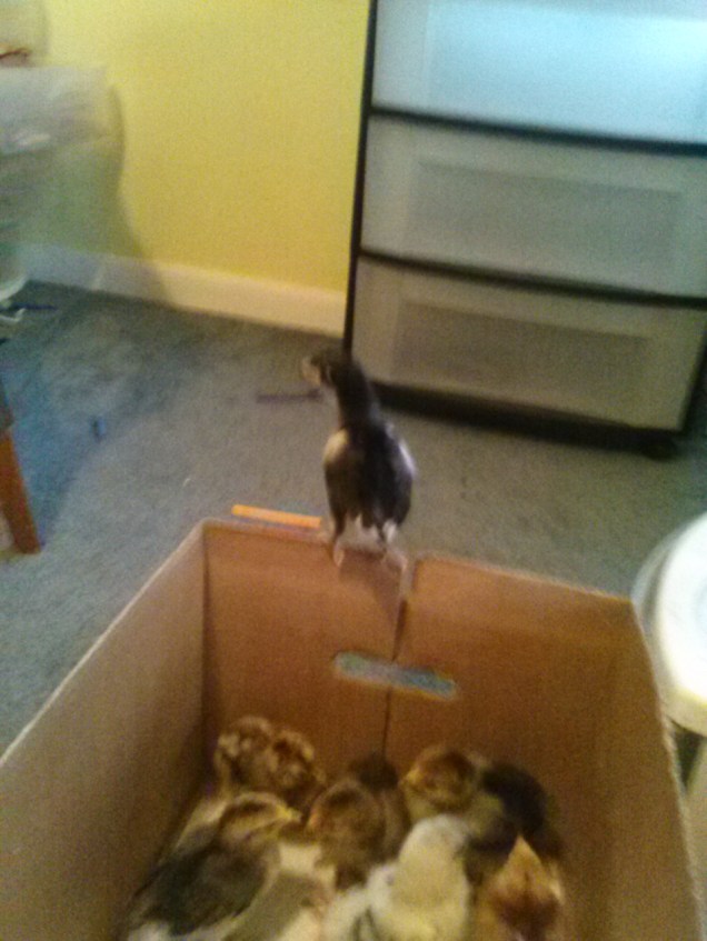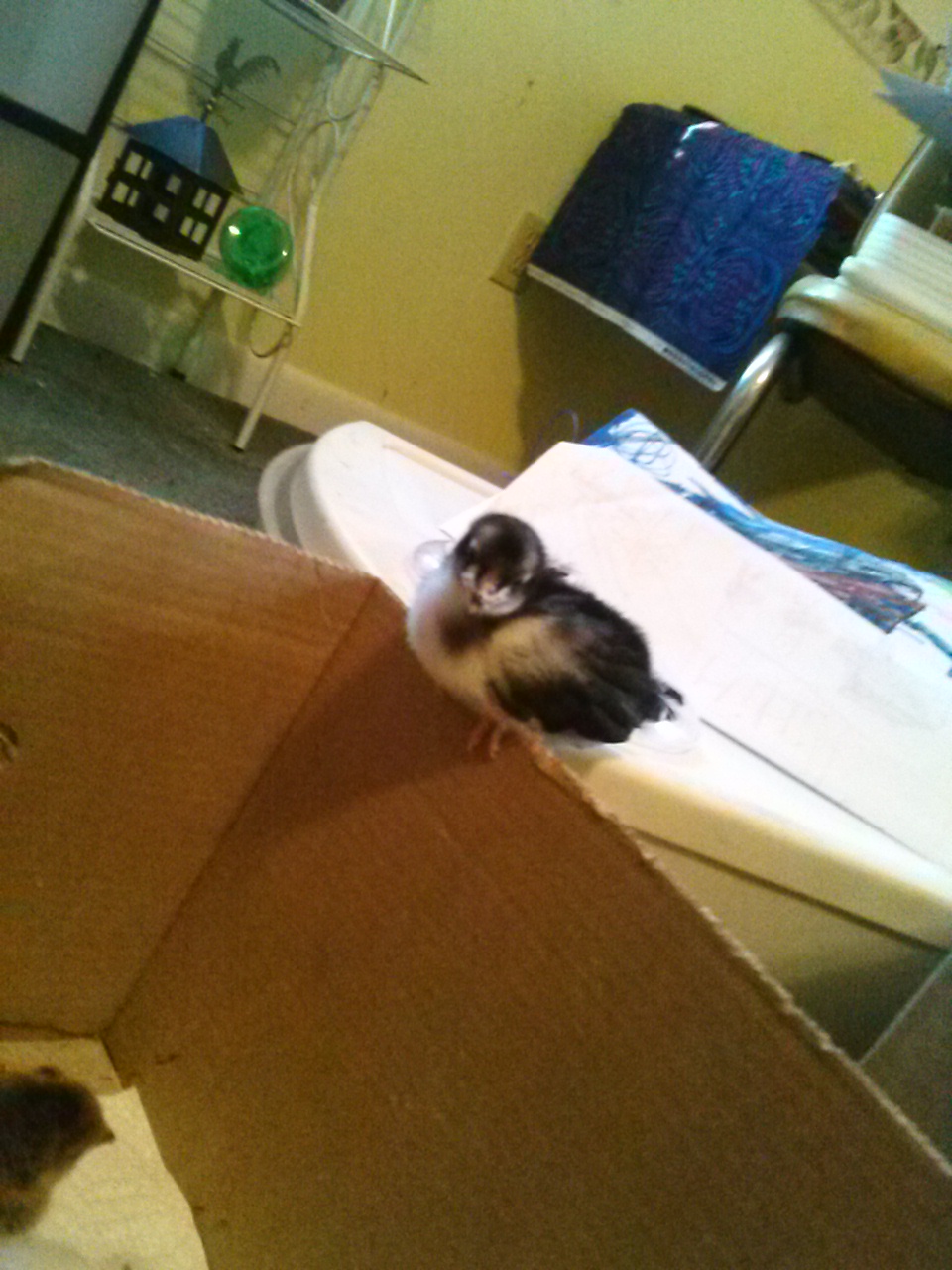 This batch and my last batch were “mixed rare breeds” orders. This means I am still trying to figure out what kinds of chickens I have – it’s fun to try to figure it out. I have been hoping for a Black Sumatra, which is one possible kind they could ship with my order. I was wondering about this one, because I saw pictures of Black Sumatra chicks and they look like little penguins, like this guy. Black & white. But other breeds’ chicks can look very similar, so it’s really hard to tell at this stage. Once I found out this one can hop out of the box, I did some reading and found that other people with Sumatras have had them jump out of the brooder at this age, and as adults they can jump 6 feet. They also like to roost in trees. So it’s very possible that this is a Black Sumatra. Time will tell. Below is a series of pictures of one of his escapes this week – some of the pics are not the best because I was taking them quickly as he moved, trying to get the best picture.