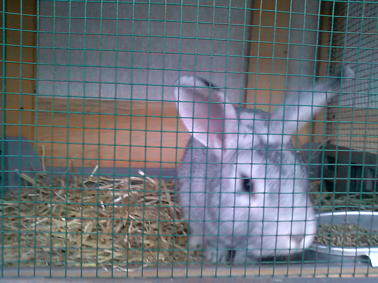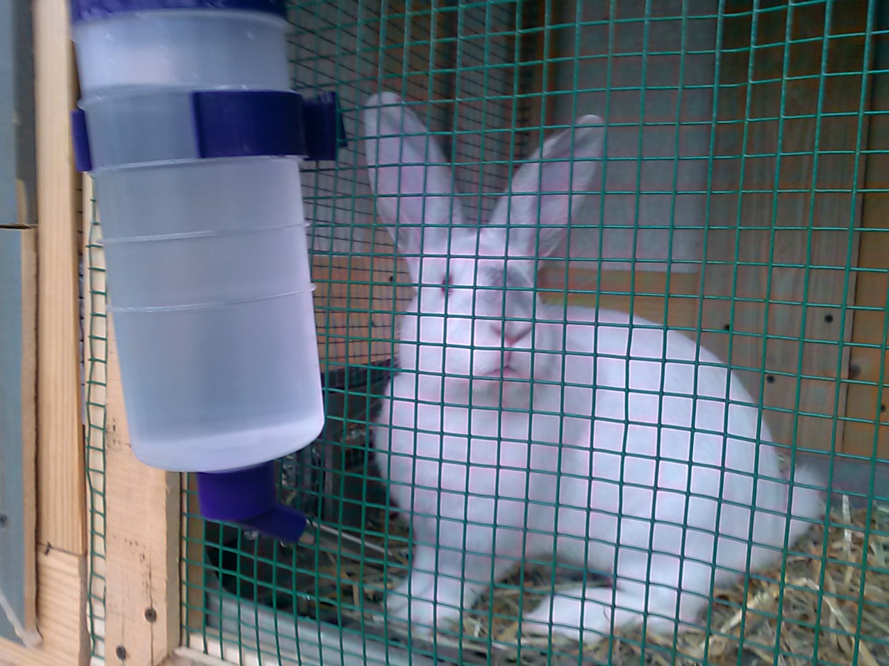 My buck in his new home.Here is our white doe in her new spot.Here is our black, already pregnant doe, hopefully getting her nest box ready for the babies (due in the next few days). Last time I gave her a nest box she used it as a litter box. We will see how she does with it.