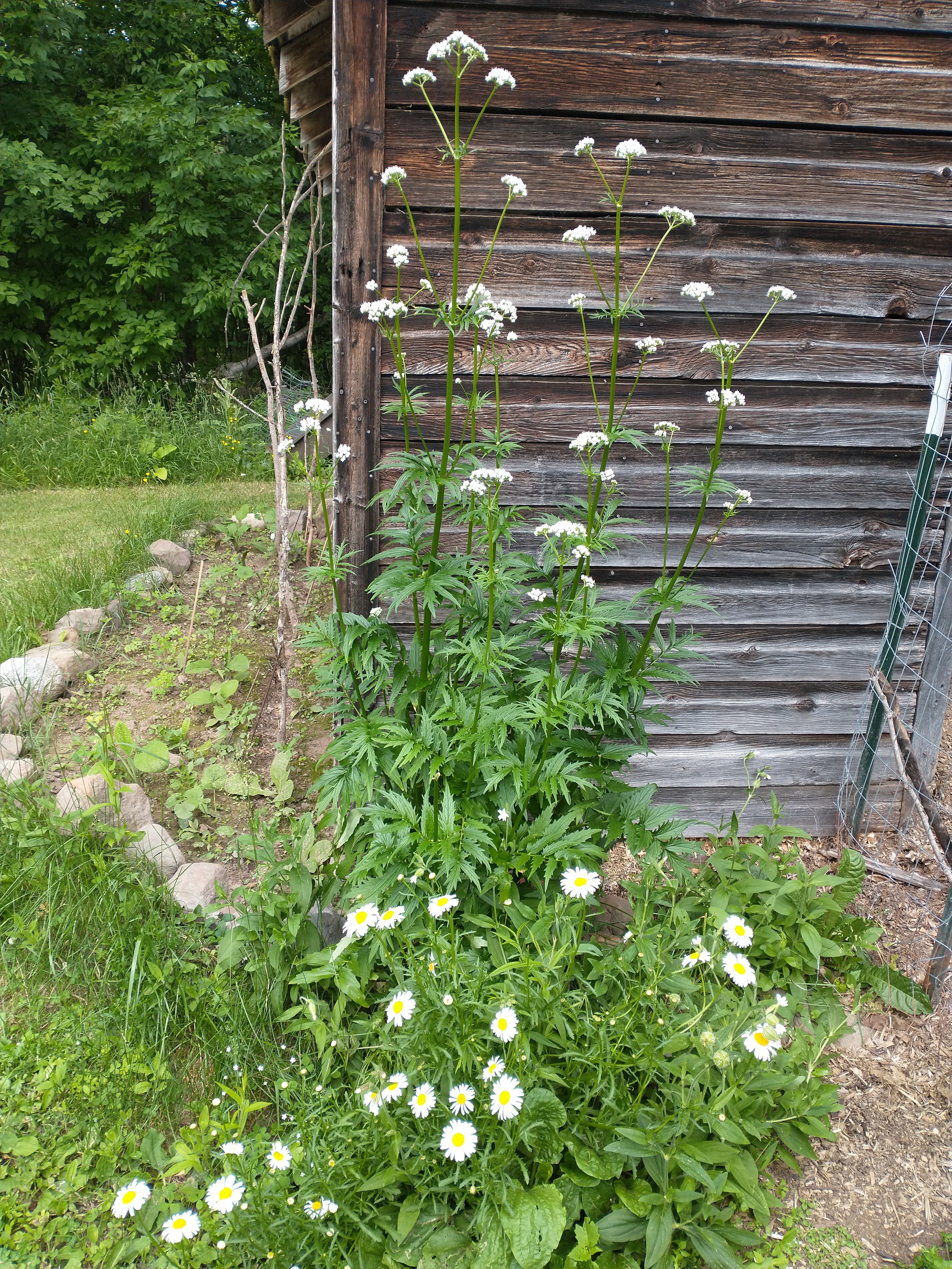 Here are some Valerian and Daisies that are growing at the front of our old chicken coop.