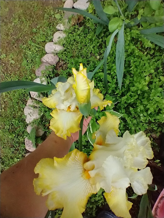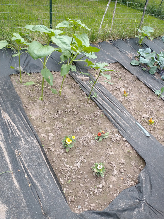 Some yellow Bearded Iris that I put in last year, and my Mongolian Giant sunflowers. They are only 2 feet tall right now but should get 12-14 feet tall by end of the summer. I also have some little zinnia plants that I bought from the store and put in, because the Brussels’ Sprouts that I planted here originally never came up. ( I have more seeds starting in the house for those now – I planted them direct the first time).