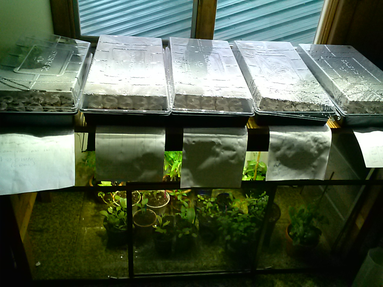 I was able to fit 8 mushroom trays per seed-starting tray. Here you see the left tray (or most of the left tray:)