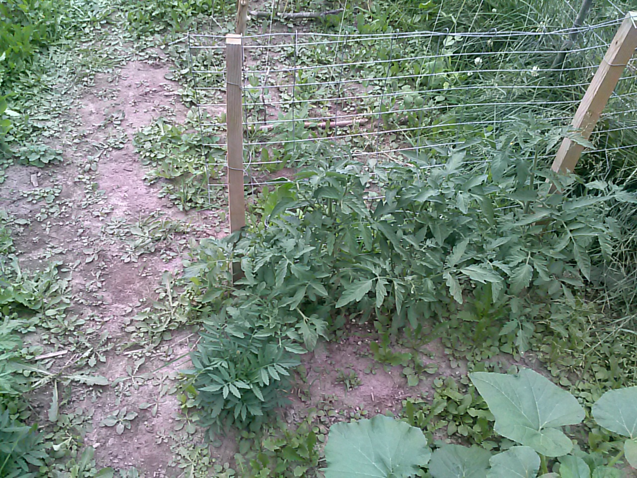 A picture of the right side of our garden. The weeds have caught up with me a bit, but my plants are not being overrun, so I’m just not worrying about it unless they are. (There is carpeting in the path, that was an old rug we cut up in an effort to keep weeds out of the main path).